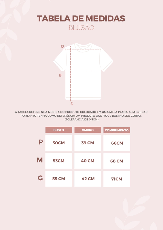 P - Largura busto 50cm | Ombro 39cm | Comprimento Frente 66cm
