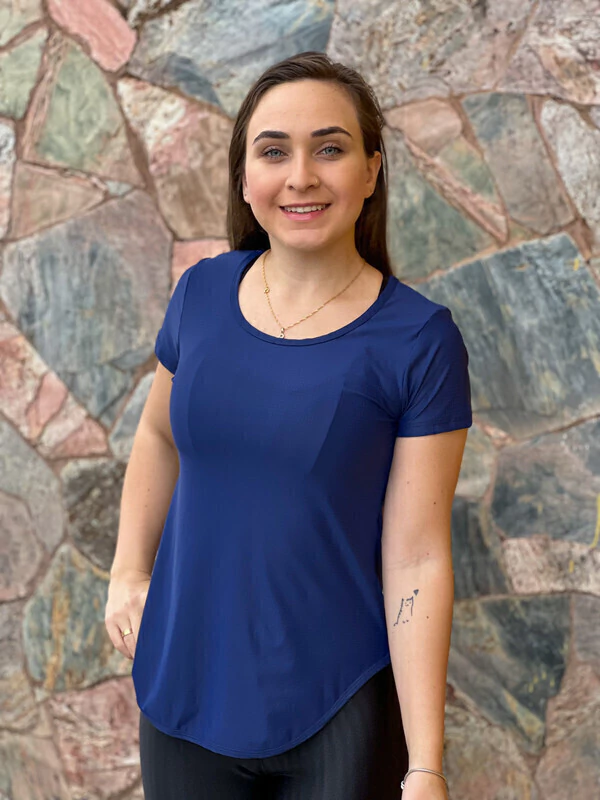A Camiseta Arredondada possui 16% de elastano e se ajusta ao corpo.