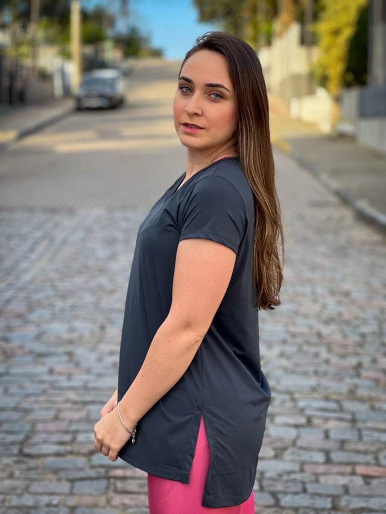 A Camiseta Long possui 10% de elastano e se ajusta ao corpo.