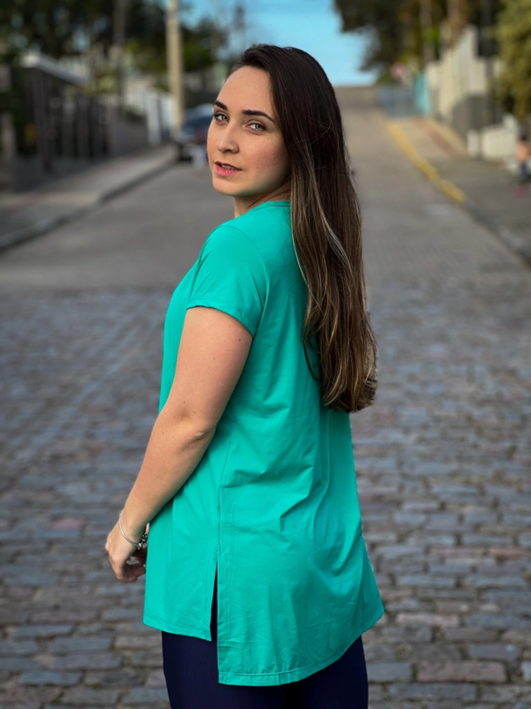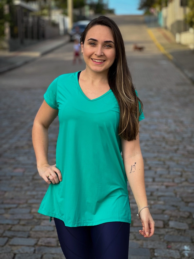 A Camiseta Long possui 10% de elastano e se ajusta ao corpo.