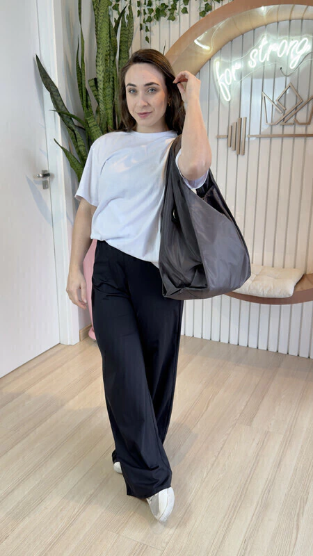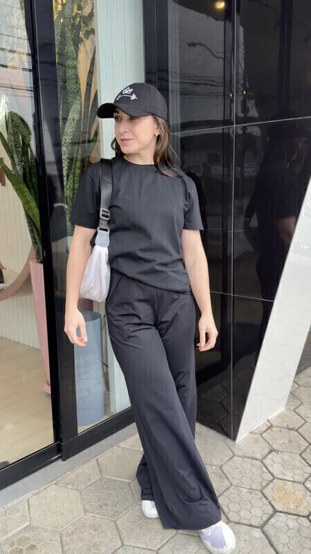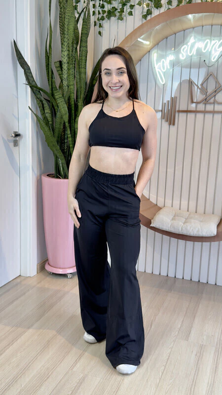 Conjunto Lizzy consiste em uma calça pantalona + top abertinho nas costas.